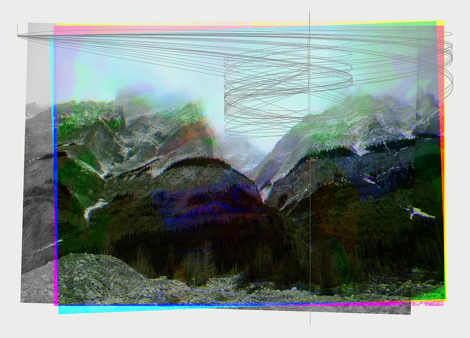 The images in Electroscapes were created through a multistep process. The artist photographed the Columbia Ice Fields in the Canadian Rockies (the largest ice mass in the Canadian Rockies that is in continuous motion and slowly receding), through a series of coloured gels, at the same time as he monitored and recorded radio-frequency radiation circulating around the landscape. The artist used FBI packet-sniffing surveillance software and an electro-smog meter to record IP tracking addresses, threshold readings and GPS data emitted from tourists wireless devices. That data was then altered through a programming language to create cartographic linear drawings, they were then combined with the actual tri-colour photographs exposed during the data-gathering process.